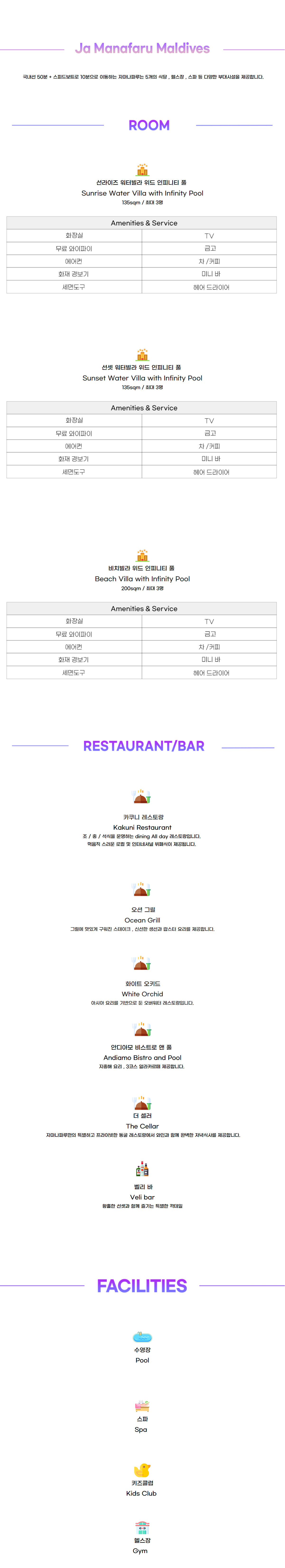 국내선 50분 + 스피드보트로 10분으로 이동하는 자마나파루는 5개의 식당 , 헬스장 , 스파 등 다양한 부대시설을 제공합니다.