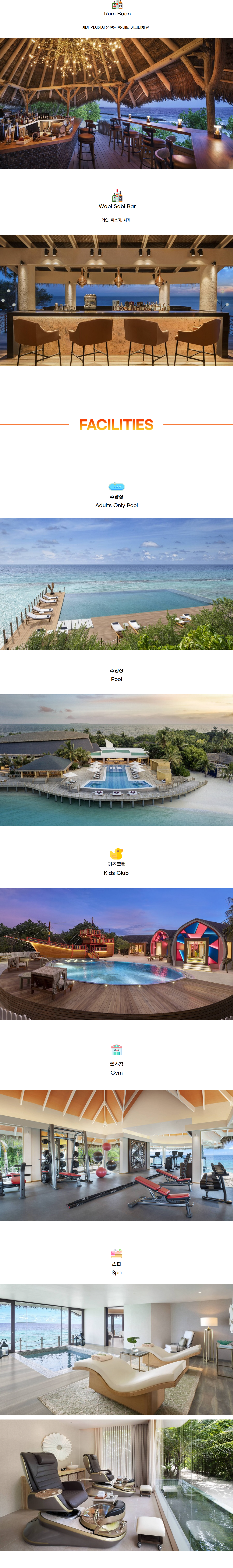 월드체인 리조트 답게 성인전용 프라이빗 풀, 아이들을 위한 키즈풀, 키즈클럽, 레스토랑 5곳, Bar 3곳, 복층 구조의 워터풀빌라 등 커플부터 가족여행까지 모두 만족할 수 있는 부대시설과 객실을 운영하고 있습니다.