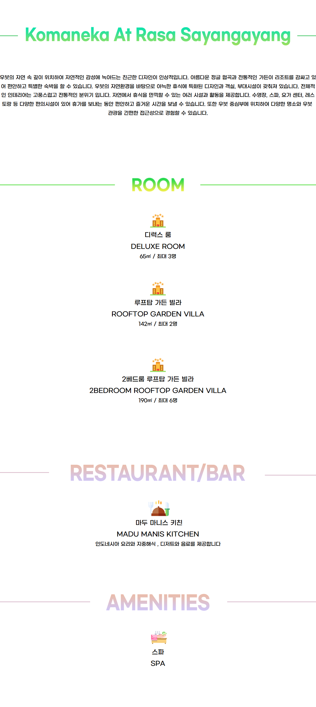 우붓의 자연 속 깊이 위치하여 자연적인 감성에 녹아드는 친근한 디자인이 인상적입니다. 아름다운 정글 협곡과 전통적인 가든이 리조트를 감싸고 있어 편안하고 특별한 숙박을 할 수 있습니다. 우붓의 자연환경을 바탕으로 아늑한 휴식에 특화된 디자인과 객실, 부대시설이 갖춰져 있습니다. 전체적인 인테리어는 고풍스럽고 전통적인 분위기 입니다. 자연에서 휴식을 만끽할 수 있는 여러 시설과 활동을 제공합니다. 수영장, 스파, 요가 센터, 레스토랑 등 다양한 편의시설이 있어 휴가를 보내는 동안 편안하고 즐거운 시간을 보낼 수 있습니다. 또한 우붓 중심부에 위치하여 다양한 명소와 우붓 관광을 간편한 접근성으로 경험할 수 있습니다.